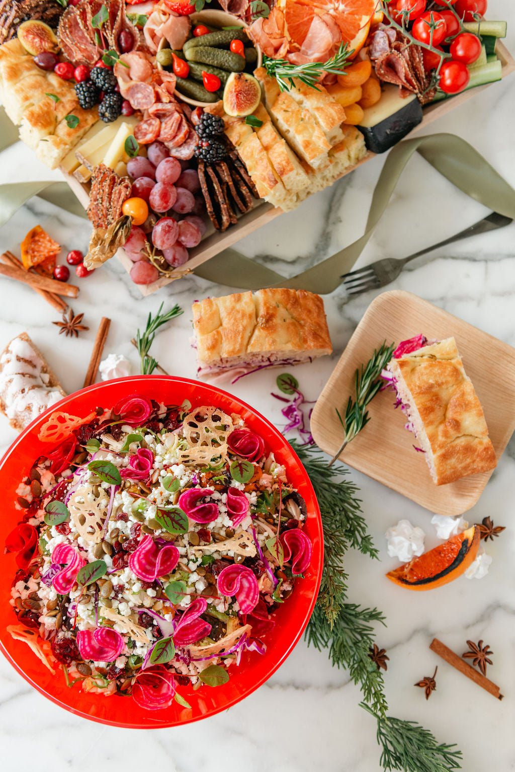 - House-Made Offerings: The only company of our kind to offer house-made items such as our House-Made Focaccia, Sandwiches, our own marinated olives (Greek family recipe), Floral Shortbread Cookies, Edible Floral Brownie, and our Lemon Squares